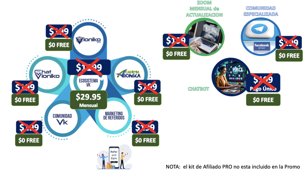 *El pago para accesar a la academia y como cliente se hace por medio de https://chatvioniko.com/ , y el acceso a todas las herramientas del chatvioniko se da en automatico , pero para accesar a VIONIKO 3.0 , requieres ir a : https://vioniko.com/marketing/?subdominio=marketing , y una vez que te registras, ingresas a tu oficina virtual de VIONIKO por medio de https://vioniko.com en la seccion de miembros, y en la parte superior derecha donde dice PAGOS adjuntas el comprobante de pago del chatvioniko , para ser activado tu VIONIKO 3.0 tal y como se muestra aqui: https://vioniko.net/pago/ . Y para accesar a tus PROMOS de la Academia, solicitas ser agregado al grupo privado de FACEBOOK y en el formulario usas tu email con el que pagaste : https://www.facebook.com/groups/academiavk , y ahi al ingresar , en la seccion de DESTACADOS podras ver el CUPON para poder pagar tus cursos incluidos con un 100% de Descuento.